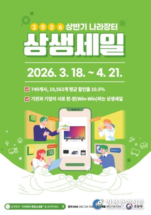 [인천광역신문] 관리자 기자 | 조달청은 조달기업의 판로를 지원하고, 공공기관에게 예산절감의 기회를 제공하기 위해 3월 18일부터 4월 21일까지 5주간 ‘2026년 상반기 나라장터 상생세일’을 개최한다.