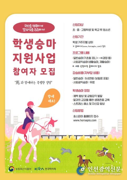 [인천광역신문] 관리자 기자 | 농림축산식품부와 한국마사회는 생활승마 저변 확대를 위해 초·중·고등학교 학생 및 학교 밖 청소년을 대상으로 전국 206개 승마시설에서 학생승마 체험을 지원할 계획이다.