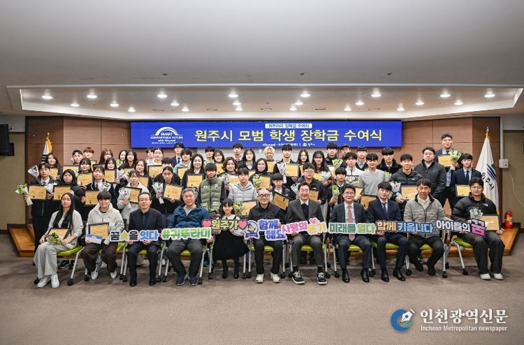 [인천광역신문] 관리자 기자 | 원주시는 17일 오전 10시, 시청 지하 1층 다목적홀에서 귀뚜라미문화재단 장학금 및 장학증서 수여식을 개최하고, 예체능 분야에서 재능과 성장 가능성을 보인 지역 중·고등학생 50명에게 장학금을 전달했다.