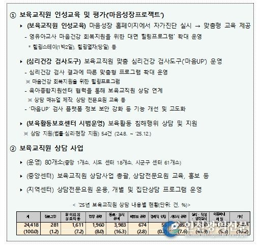 첫째, 중앙·지방 육아종합지원센터에 보육교직원의 보육활동을 보호·지원하는 전담조직을 둘 수 있도록 법적 근거를 마련했다. 이를 통해 보육교직원이 부당하게 보육활동 침해를 당하는 경우 전담조직을 통해 심리·법률지원 등 보호·지원을 받을 수 있도록 했다.