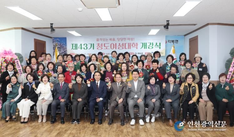 [인천광역신문] 관리자 기자 | 청도군은 17일 오후 2시 각북면사무소 회의실에서 수강생과 지역단체장, 여성단체장 등 60여 명이 참석한 가운데 제43기 청도여성대학 개강식을 개최했다.