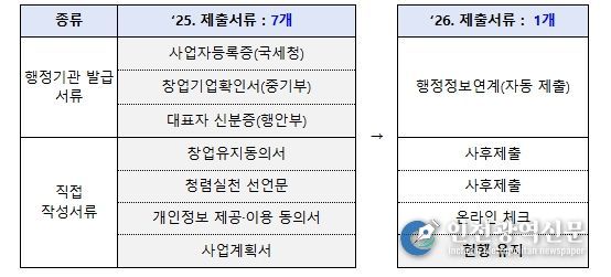 행정정보 연결로 사업자등록증, 재무제표 등 행정서류는 자동수집한다. 개인정보제공동의서 등은 온라인 체크로 대체한다. 또한, 기업 심사에 불필요한 서류는 폐지하거나 선정된 기업만 제출한다. 사업계획서 제한 분량도 평균 14장에서 9.4장까지 30% 이상 감축할 계획이다.