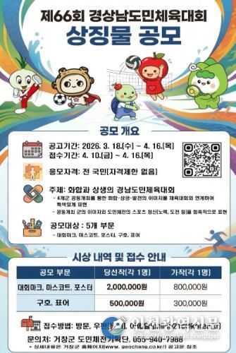 이광희 도민체전기획단장은 “4개군의 정체성과 화합·상생의 경상남도민체육대회를 잘 어우러지게 담아낼 수 있는 참신한 작품들이 접수되기를 기대한다”며 “2027년 경상남도민체육대회에 대한 전 국민의 관심과 참여를 바란다”고 말했다.
