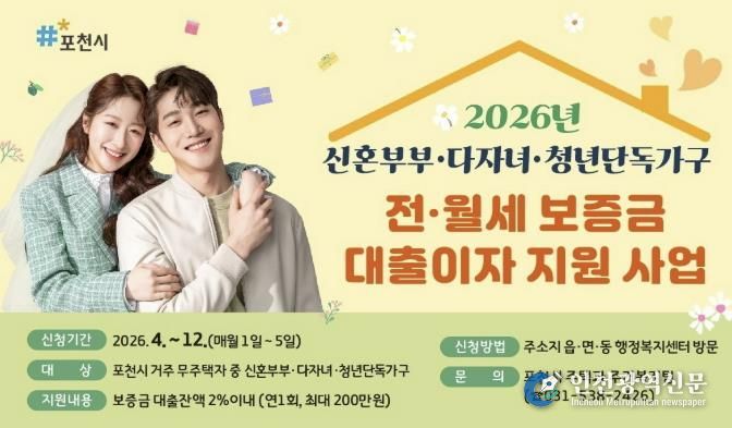 [인천광역신문] 관리자 기자 | 포천시는 ‘2026년 신혼부부·다자녀·청년가구 전월세 보증금 대출이자 지원사업’을 추진한다.