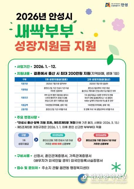 [인천광역신문] 관리자 기자 | 안성시는 3월 13일'안성시 출산·양육 지원 조례'일부개정을 통해 새싹부부성장지원금 연령 기준(49세이하 신혼부부)을 폐지하여 지원 대상을 확대했다.