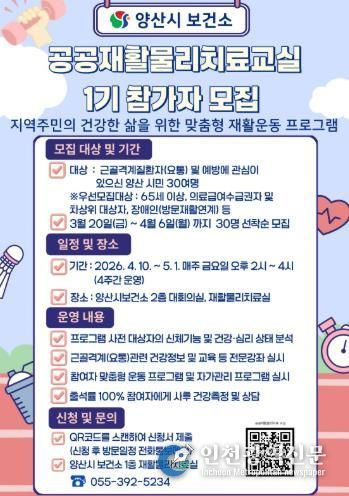 모집 인원은 30명이며, 65세 이상 어르신, 의료급여 수급자, 차상위계층, 장애인 등은 우선 접수 대상이고 양산시보건소 1층 재활물리치료실로 방문 또는 보건소 홈페이지에 업로드된 QR코드를 통해 신청 가능하다.