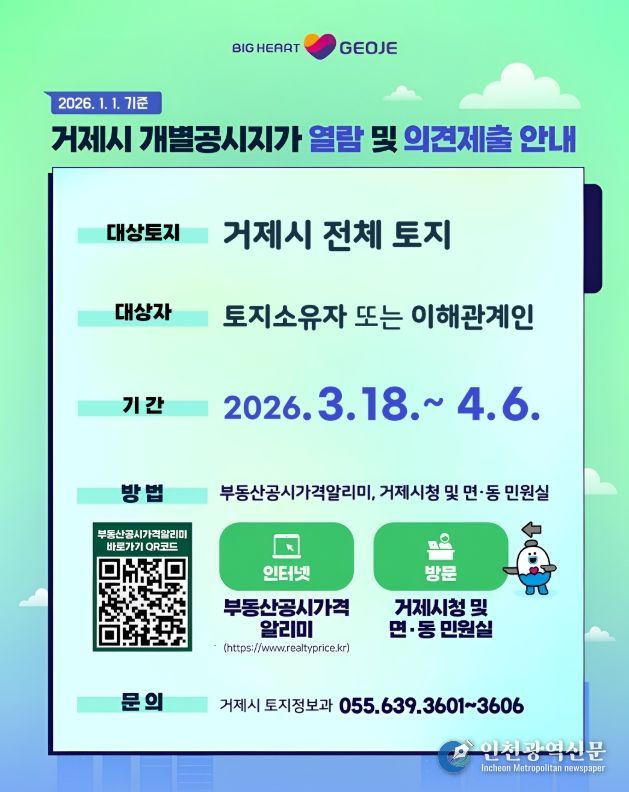 [인천광역신문] 관리자 기자 | 거제시는 2026년 1월 1일 기준 개별공시지가(안)에 대하여 3월 18일부터 4월 6일까지 열람 및 의견을 접수한다고 밝혔다.