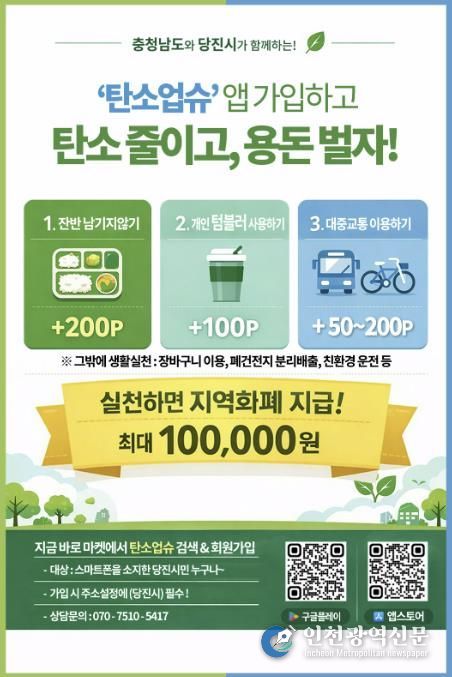 [인천광역신문] 관리자 기자 | 당진시는 기후위기 대응을 강화하고 시민들의 자발적인 탄소중립 실천을 확산하기 위해 충남형 탄소중립포인트제 ‘탄소업슈’ 가입자 확대를 본격 추진한다고 19일 밝혔다.