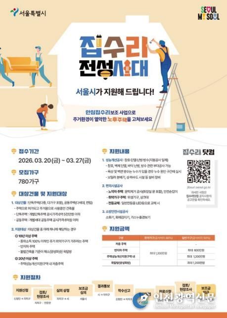 [인천광역신문] 관리자 기자 | 중랑구가 3월 20일부터 27일까지 '2026 안심집수리 보조사업' 신청자를 모집한다. 주민 주거환경 개선과 에너지 성능 향상을 통한 온실가스 배출 저감을 위한 사업이다.