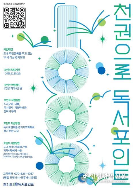 [인천광역신문] 관리자 기자 | 경기도가 도민 독서 습관 형성과 지역서점 이용 확대를 위한 ‘천권으로 독서포인트’ 사업을 개편했다. 적립 한도와 사용처를 확대하고 인증 절차를 간소화한 것이 핵심이다.