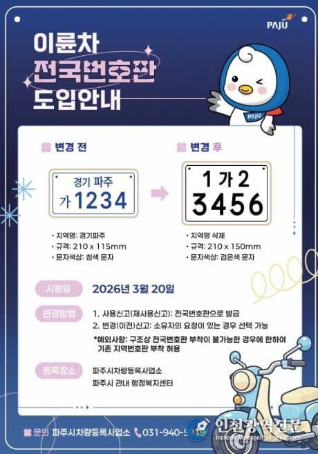 [인천광역신문] 관리자 기자 | 파주시는 오는 20일부터 이륜차 전국번호판 제도를 본격 시행한다.