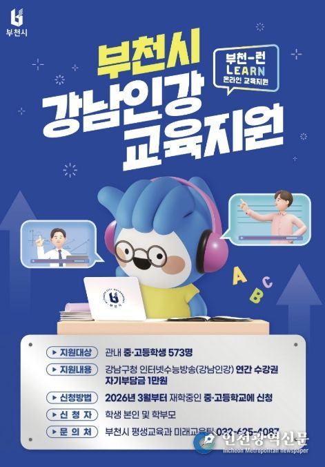 [인천광역신문] 관리자 기자 | 부천시는 2026년 ‘부천-런(Learn) 온라인 교육지원’ 사업을 추진한다고 19일 밝혔다. 이는 지난해에 이어 시행되는 것으로, 관내 중·고등학생들에게 온라인 교육 기회를 제공하고 가정의 사교육비 부담을 완화하는 데 중점을 둔다.