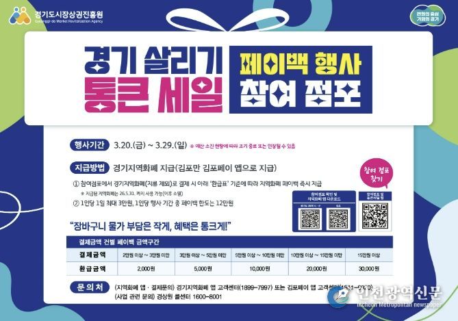 참여 점포에서 경기지역화폐(지류 제외)로 결제하면 결제 금액에 따라 즉시 페이백을 지급한다. 2만~3만원 미만은 2000원, 3만~5만원 미만은 5000원, 5만~10만원 미만은 1만원, 10만~15만원 미만은 2만원, 15만원 이상은 3만원을 환급한다. 환급은 1인당 하루 최대 3만원까지 받을 수 있으며, 행사 기간 동안 총 12만원까지 받을 수 있다. 지급된 지역화폐는 올해 5월 31일까지 사용 가능하며 이후 소멸된다.