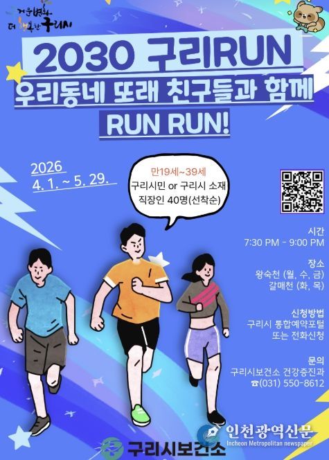 [인천광역신문] 관리자 기자 | 구리시는 4월 1일부터 5월 29일까지 2030 청년층의 건강증진과 규칙적인 신체활동 실천을 돕기 위해 왕숙천과 갈매천에서 ‘상반기 2030 구리RUN’ 프로그램을 운영한다고 밝혔다.