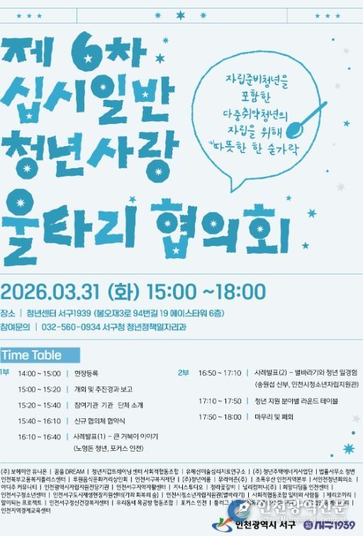 [인천광역신문] 관리자 기자 | 인천 서구는 오는 3월 31일 지역 청년의 자립과 정주여건 개선을 위한 ‘제6차 십시일반 청년사랑 울타리 협의회’를 개최한다고 밝혔다.