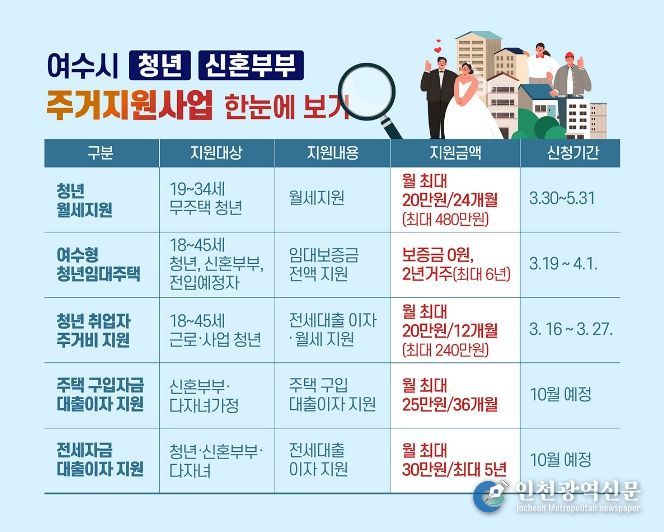 [인천광역신문] 관리자 기자 | 여수시가 청년과 신혼부부, 다자녀 가구의 주거비 부담을 줄이고 안정적 정착을 돕기 위해 45억 원을 투입, ‘주거지원 5종 패키지’를 추진한다.