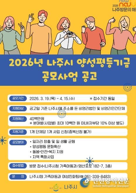 [인천광역신문] 관리자 기자 | 전남 나주시가 일·생활 균형과 양성평등 문화 확산, 돌봄과 안전 복지 지원을 위한 ‘2026년 나주시 양성평등기금 공모사업’을 추진한다.