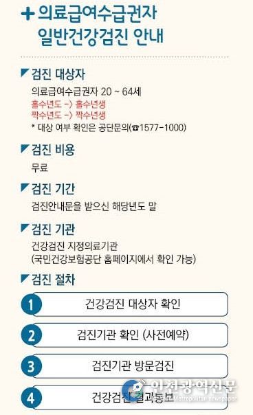 의료급여 수급권자 일반건강검진은 고혈압, 당뇨병 등 심뇌혈관질환을 조기 발견해 치료와 관리로 연계하기 위한 사업이다.