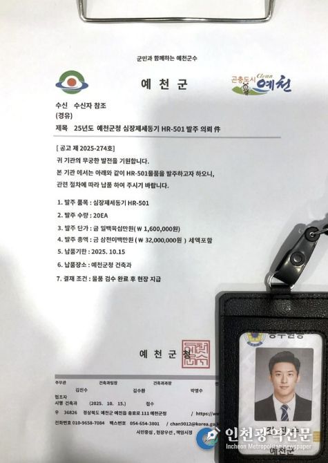 [인천광역신문] 관리자 기자 | 예천군은 최근 군청 공무원을 사칭해 금전 요구나 물품 구매를 유도하는 사기 시도가 잇따라 발생함에 따라 군민과 지역 업체를 대상으로 각별한 주의를 당부했다.
