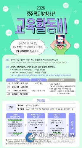 광주광역시는 학교 밖 청소년의 교육 기회를 확대하고 안정적인 성장을 뒷받침하기 위해 ‘학교 밖 청소년 교육활동비 지원사업’을 운영키로 하고, 오는 23일부터 신청을 받는다.