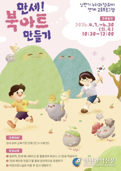 [인천광역신문] 관리자 기자 | 화성특례시 화성시독립운동기념관은 관내 유아 교육기관을 대상으로 교육프로그램 ‘만세! 북아트 만들기’를 4월 7일부터 6월 30일까지 매주 화요일과 목요일에 운영한다.