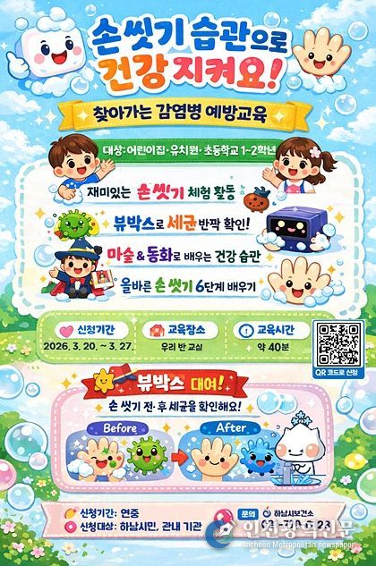 [인천광역신문] 관리자 기자 | 하남시보건소는 오는 4월 6일부터 10월 2일까지 관내 어린이 대상 ‘손 씻기 교육’을 운영하며, 3월 20일부터 27일까지 관내 교육기관을 대상으로 네이버 폼을 통해 교육 신청을 받는다고 밝혔다.