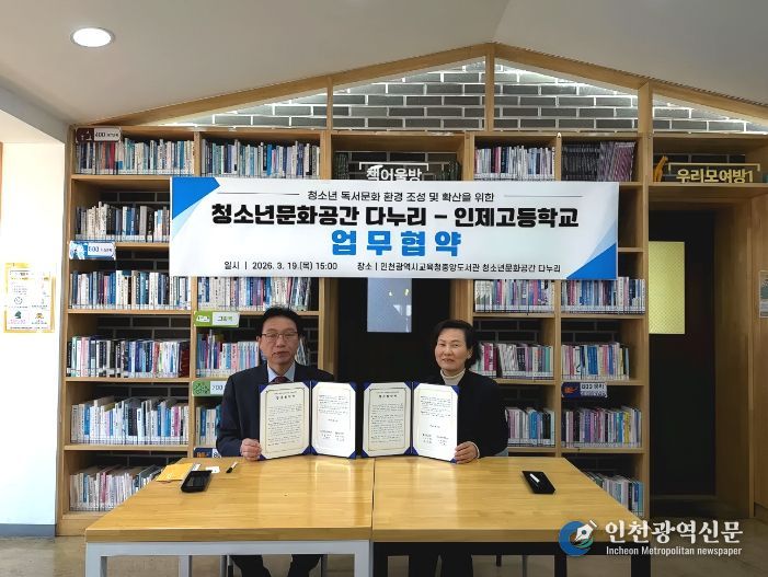 [인천광역신문] 관리자 기자 | 인천광역시교육청중앙도서관 청소년문화공간 다누리는 19일, 인제고등학교와 ‘청소년 독서문화 환경 조성 및 확산을 위한 업무협약’을 체결했다.