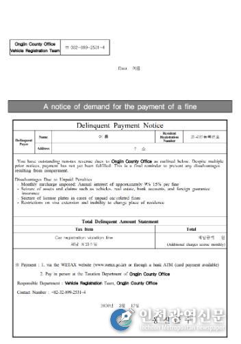 [인천광역신문] 관리자 기자 | 옹진군이 자동차 과태료 외국인 체납자들을 대상으로, 영어로 번역된‘자동차 과태료 체납 안내문’을 발송한다고 밝혔다.