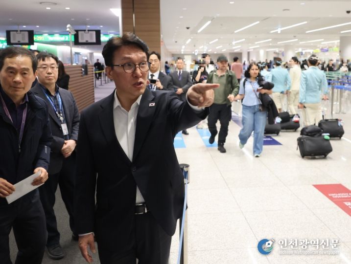 [인천광역신문] 관리자 기자 | 김민석 국무총리는 3월 19일 오후, 미국・스위스 방문을 마치고 귀국한 직후 인천공항 현장을 찾아 BTS 컴백 공연과 관련 입국장 상황을 직접 점검했다.