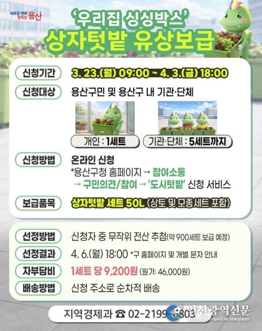 [인천광역신문] 관리자 기자 | 서울 용산구가 아파트 베란다와 주택 마당 등 생활공간에서 손쉽게 작물을 키울 수 있는 ‘상자텃밭’ 보급에 나선다. 소소한 수확의 즐거움과 함께 도시농업을 일상으로 확산하겠다는 취지다.