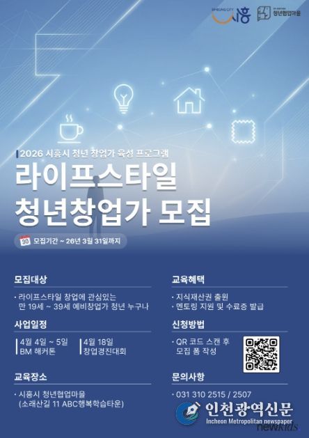 [인천광역신문] 관리자 기자 | 시흥시는 ‘2026 청년 창업가 육성 프로그램’의 일환으로 라이프스타일 분야 예비 청년창업가를 대상으로 실전형 창업 프로그램인 ‘창업 해커톤’과 ‘창업 경진대회’를 운영하고, 오는 3월 31일까지 참가자 30명을 모집한다.