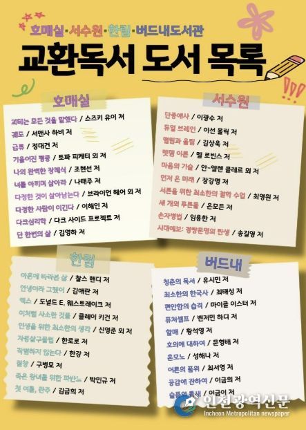 [인천광역신문] 관리자 기자 | 수원시 권선구 4개 공공도서관(호매실·서수원·한림·버드내도서관)이 책을 매개로 서로의 생각과 감상을 나누는 ‘교환독서 클럽’ 참여팀을 모집한다.