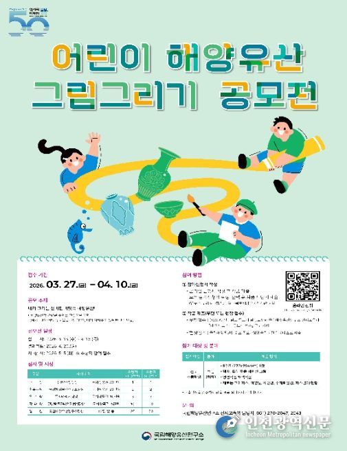 [인천광역신문] 관리자 기자 | 국가유산청은 국립해양유산연구소는 한국수중발굴 50주년을 기념하여 3월 27일부터 4월 10일까지 전국 초등학생을 대상으로 '어린이 해양유산 그림그리기 공모전'을 개최한다.