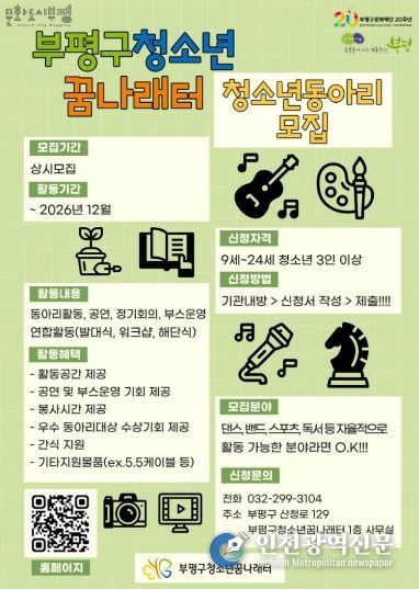 [인천광역신문] 관리자 기자 | 부평구청소년꿈나래터는 ‘2026년도 청소년자율동아리’를 상시 모집한다고 23일 밝혔다.