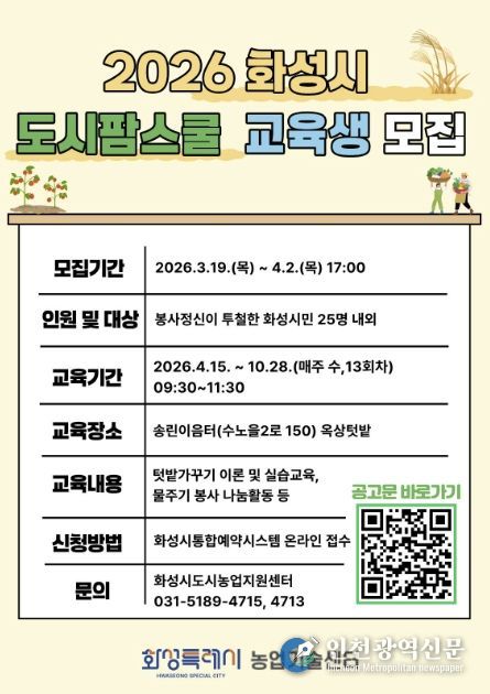 [인천광역신문] 관리자 기자 | 화성시농업기술센터는 도시민의 농업 이해를 높이고 공동체 문화를 확산하기 위해 ‘공공기관 연계 도시팜스쿨’ 교육생을 모집한다.