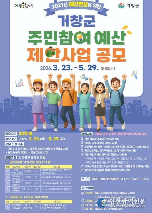 [인천광역신문] 관리자 기자 | 거창군은 3월 23일부터 5월 29일까지 예산 편성 과정에 주민의 의견을 실질적으로 반영하고 지역에 필요한 사업을 직접 제안할 수 있는 ‘2027년 주민참여예산 제안사업 공모’를 추진한다.