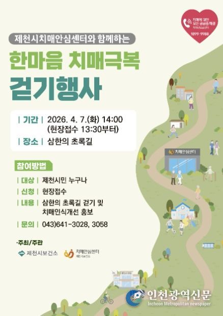 [인천광역신문] 관리자 기자 | 제천시는 오는 4월 7일 삼한의 초록길 일원에서 ‘한마음 치매극복 걷기 행사’를 개최한다고 밝혔다.