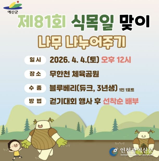 [인천광역신문] 관리자 기자 | 예산군은 제81회 식목일을 맞아 3월 31일 나무심기 행사와 4월 4일 나무 나누어주기 행사를 개최한다고 밝혔다.
