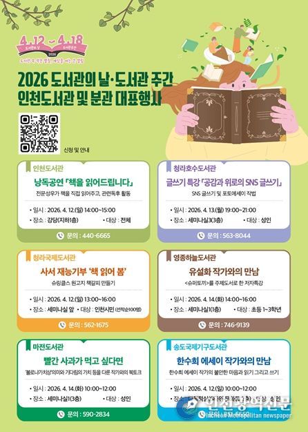 [인천광역신문] 관리자 기자 | 인천광역시인천도서관은 도서관의 날(4월 12일) 및 도서관 주간(4월 12일~4월 18일)을 맞아 인천도서관과 각 분관에서 시민과 함께하는 다양한 독서문화 행사를 운영한다고 밝혔다.