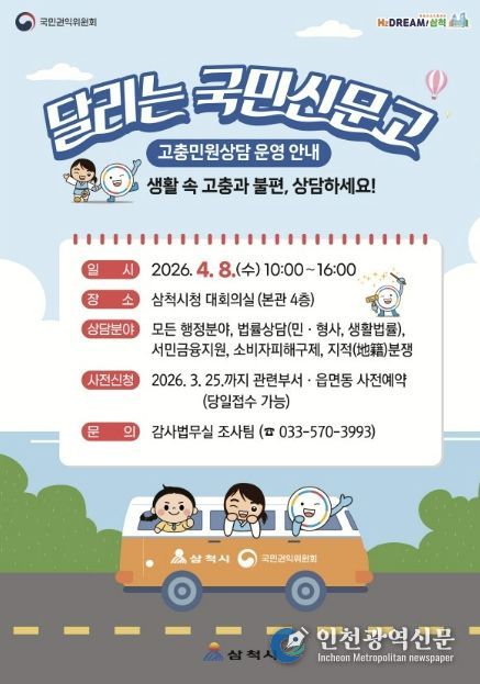 [인천광역신문] 관리자 기자 | 삼척시가 4월 8일 오전 10시부터 오후 4시까지 시청 본관 대회의실에서 국민권익위원회와 함께 ‘달리는 국민신문고’를 운영한다.