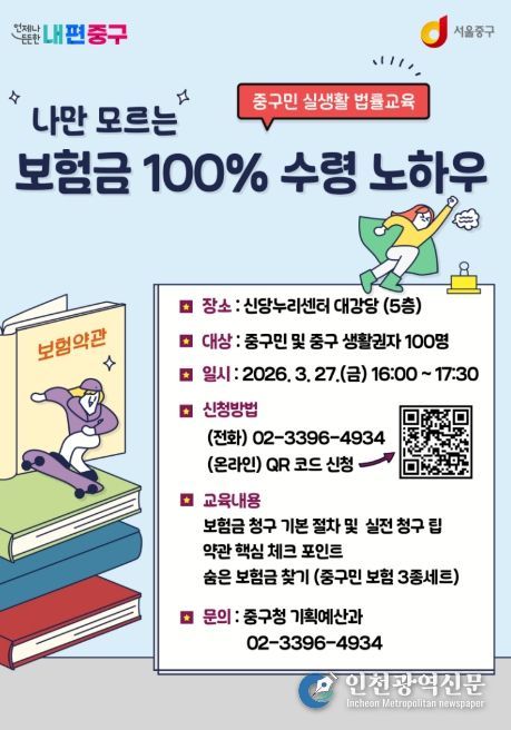 [인천광역신문] 관리자 기자 | 서울 중구는 오는 27일 오후4시 신당누리센터 대강당에서 '나만 모르는 보험금 100% 수령 노하우'를 주제로 중구민 실생활 법률교육을 실시한다.