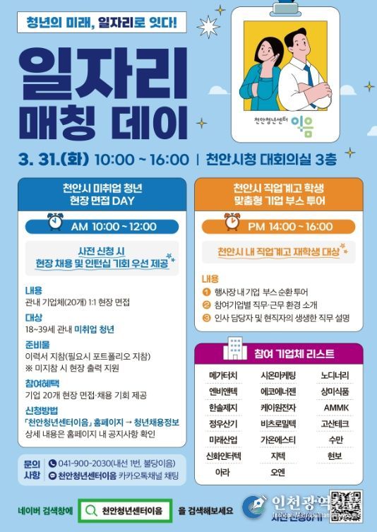 [인천광역신문] 관리자 기자 | 천안시는 오는 31일 시청 대회의실에서 지역 청년 구직자와 우수 기업을 직접 연결하는 ‘청년 일자리 매칭데이’를 개최한다.