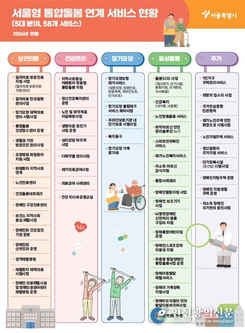 서울시는 어르신, 장애인이 병원이나 시설에 입소하지 않고 살던 곳에서 의료·건강·요양·돌봄·주거 서비스를 통합적으로 맞춤 제공하는 ‘서울형 통합돌봄 서비스’를 본격 시행한다고 밝혔다. 시는 시민 궁금증을 해결해 주고 제도 조기 정착을 돕기 위해 통합돌봄 종합상황실(돌봄복지과) 및 콜센터를 운영한다.