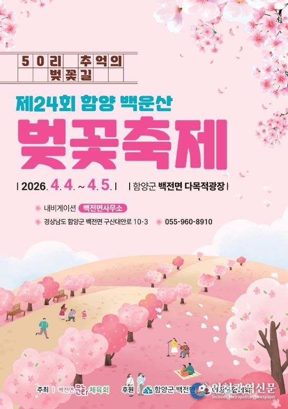 [인천광역신문] 관리자 기자 | 함양군은 ‘제24회 함양 백운산 벚꽃축제’가 오는 4월 4일부터 5일까지 이틀간 백전면 다목적광장 일원에서 개최된다고 밝혔다.