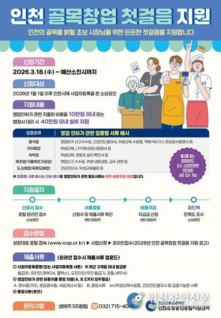 사업 수행은 센터가 담당하며, 신청 방법과 세부 일정 등 관련 사항은 성장대로 포털 및 인천소상공인종합지원센터 홈페이지를 통해 확인할 수 있다.
