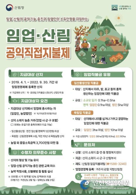 [인천광역신문] 관리자 기자 | 홍성군은 내달 1일부터 30일까지 임업·산림 공익직접지불금(이하‘임업직불금’) 방문 신청을 받는다고 밝혔다.