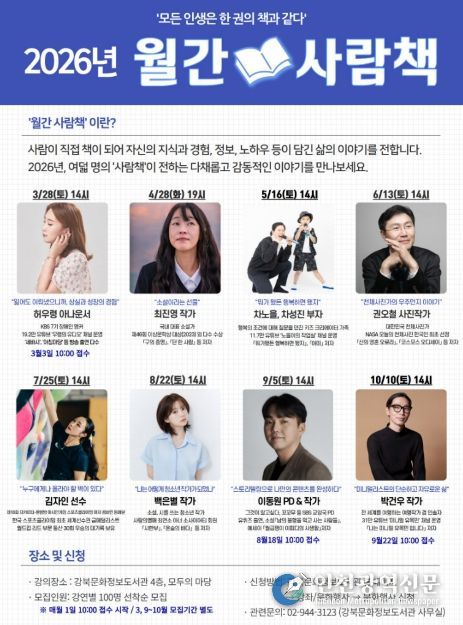 김윤기 강북구도시관리공단 이사장은 “월간 사람책 강연을 통해 서로 다른 삶의 이야기를 나누고 공감하는 가운데, 삶의 가치를 함께 성찰하는 의미 있는 시간이 되길 기대한다”고 말했다.