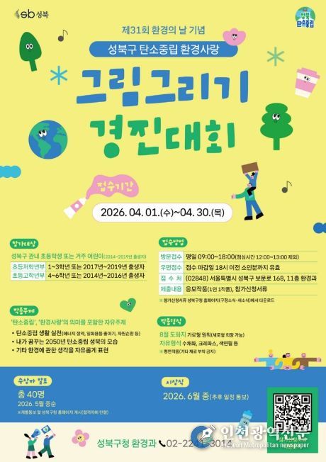 [인천광역신문] 관리자 기자 | 서울 성북구가 제31회 환경의 날(6월 5일)을 맞아 ‘2026년 성북구 탄소중립 환경사랑 그림그리기 경진대회’를 실시한다.