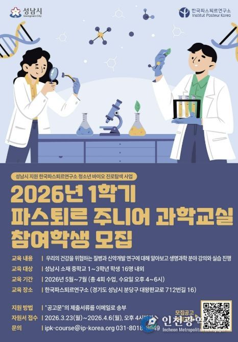 [인천광역신문] 관리자 기자 | 성남시는 2026년 상반기 한국파스퇴르연구소 ‘파스퇴르 주니어 과학교실’ 참여 학생을 모집한다.