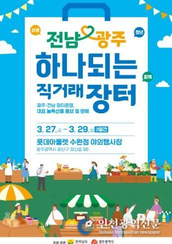 [인천광역신문] 관리자 기자 | 전라남도와 광주광역시는 27일부터 3일간 광주 롯데아울렛 수완점에서 ‘2026 전남·광주 하나되는 직거래장터’를 운영한다고 밝혔다.